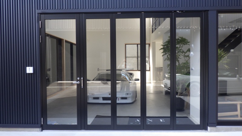 全面開放することができる特殊なガラス扉です。通常時は左側の扉だけで出入りします。車を出し入れするときは全面に解放することができます。